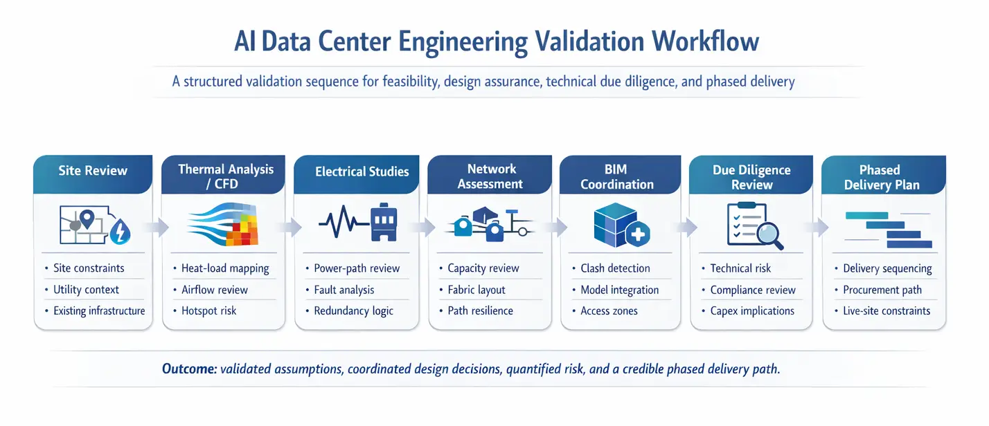 En esta fase de validación es donde la calidad de la consultoría se hace visible. El enfoque documentado de Azura combina la revisión del emplazamiento, la revisión de la documentación técnica, el análisis térmico dirigido por CFD, el análisis del sistema de energía eléctrica y, cuando es necesario, Modelado de información para la construcción (BIM) y la debida diligencia técnica.